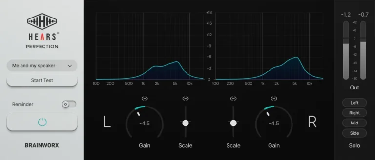 developed by Brainworx in collaboration with the HEARS team, HEARS Perfection is the next generation of personalized hearing compensation. Using an optimized built-in hearing test, it pinpoints your hearing loss and applies correction in real time, providing you with a perfectly smooth and neutral listening environment tailored to the unique profile of your ears.